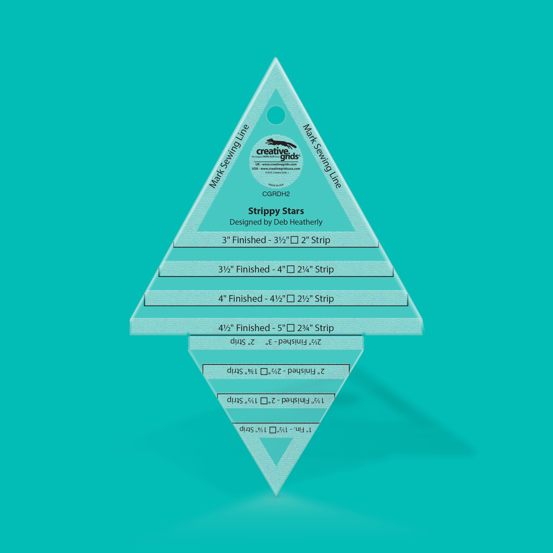 Make star point units quickly and easily in 8 different finished sizes from 1-1/2 to 4-1/2 inches. The triangle units are created with squares and strips - without ever cutting a triangle! The cutting requirements for each is printed right on the tool! Units float so you won't cut off the points when sewing the blocks together.