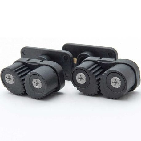 Bungee Grabbers™ are compatible with HQ Gallery 2™, HQ Studio™ 1 & 2 and HQ Fusion™ Frames. Special cam cleats lock the bungee cords in place after a quilt sandwich is secured in the side clamps. The original factory-installed bungee clamp will need to be removed from the Side Arm assembly before installing the Bungee Grabbers.