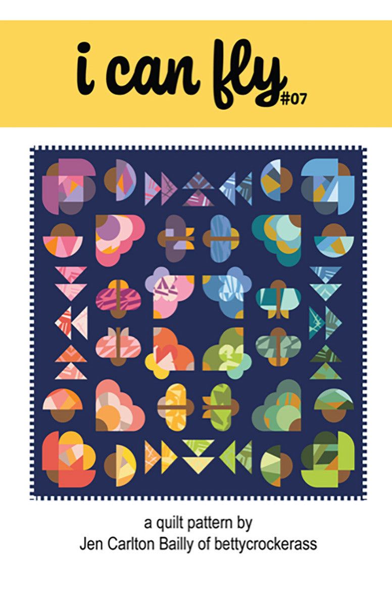 The I Can Fly Quilt by Jen Carlton Bailly of bettycrockerass was inspired by the bright colorful artwork of Mary Blair in the Golden Book "I Can Fly" and is fat quarter friendly. Come, fly with me, learn how to sew curves, and make these improv patchwork moths. Finished size is 80" x 80".