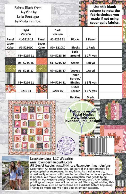 Everybody loves pumpkins- especially in a quilt. This adorable one uses a panel and a layer cake from Hey Boo by Lella Boutique by Moda Fabrics. Quick and easy and finishes at 64 1/2" x 74 1/2".