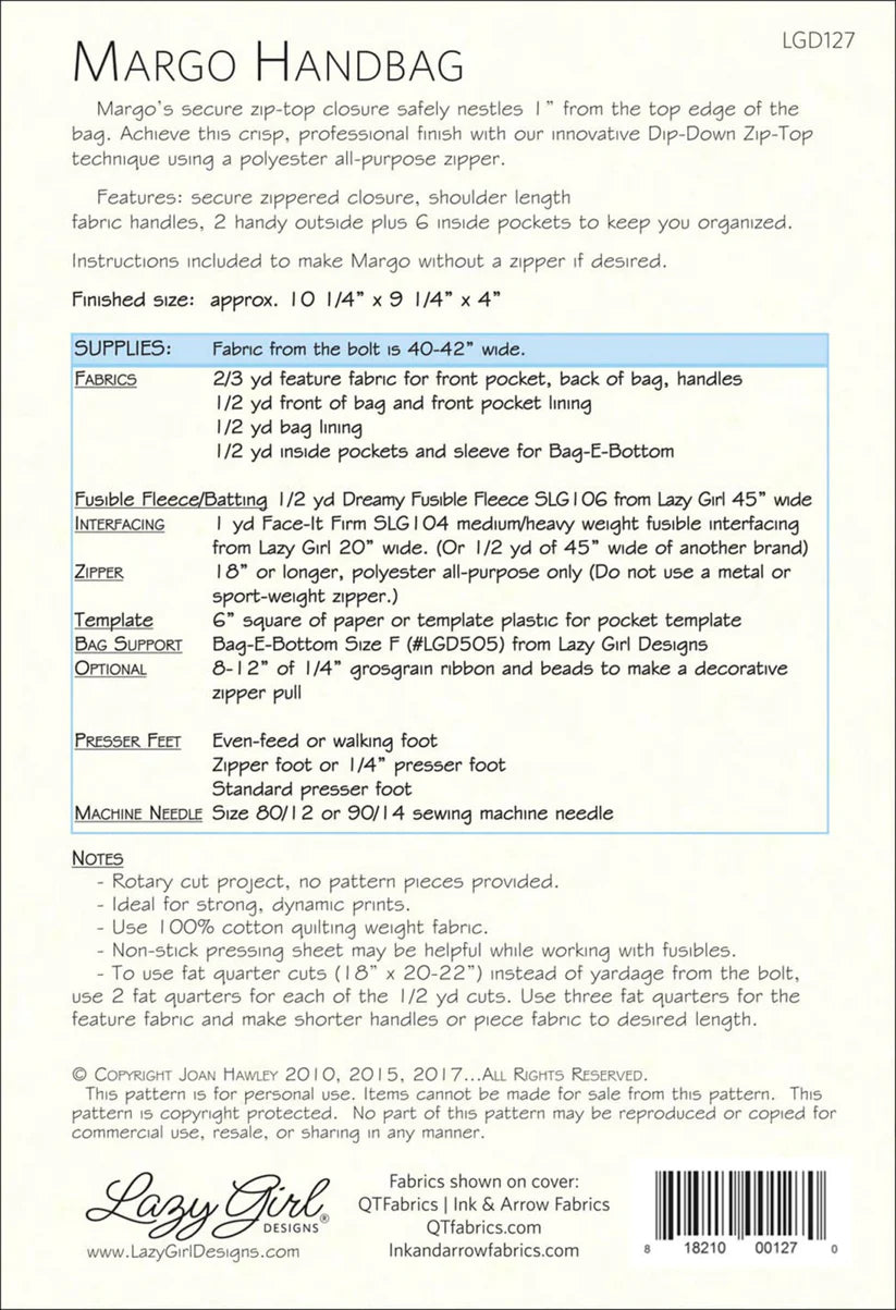Margo’s secure zip-top closure safely nestles 1” from the top edge of the bag. Achieve this crisp, professional finish with our innovative Dip-Down Zip-Top technique using a polyester all-purpose zipper. Features: secure zippered closure, shoulder length fabric handles, 2 handy outside plus 6 inside pockets to keep you organized. Instructions included to make Margo without a zipper if desired.