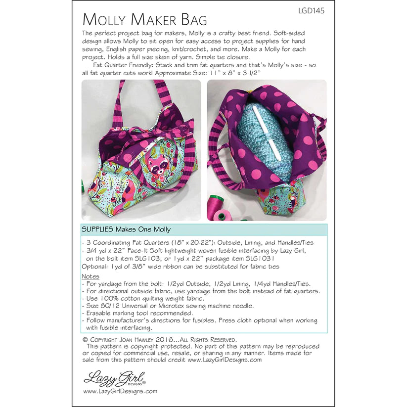 The perfect project bag for makers, Molly is a crafty best friend. Soft-sided design allows Molly to sit open for easy access to project supplies for hand sewing, English paper piecing, knit/crochet, and more. Make a Molly for each project. Holds a full size skein of yarn. Simple tie closure.
