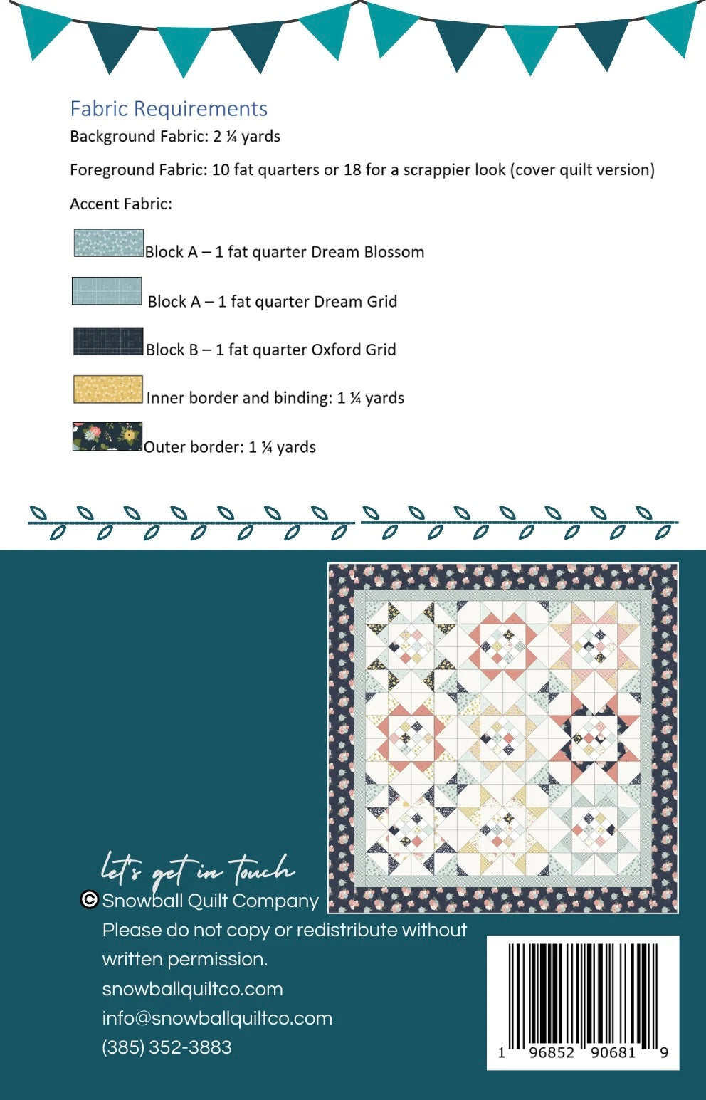 Beautiful fat quarter pattern by Snowball Quilt Company offering cutting instructions for a more economical fabric usage. The scrappy version is what is pictured on the front.
