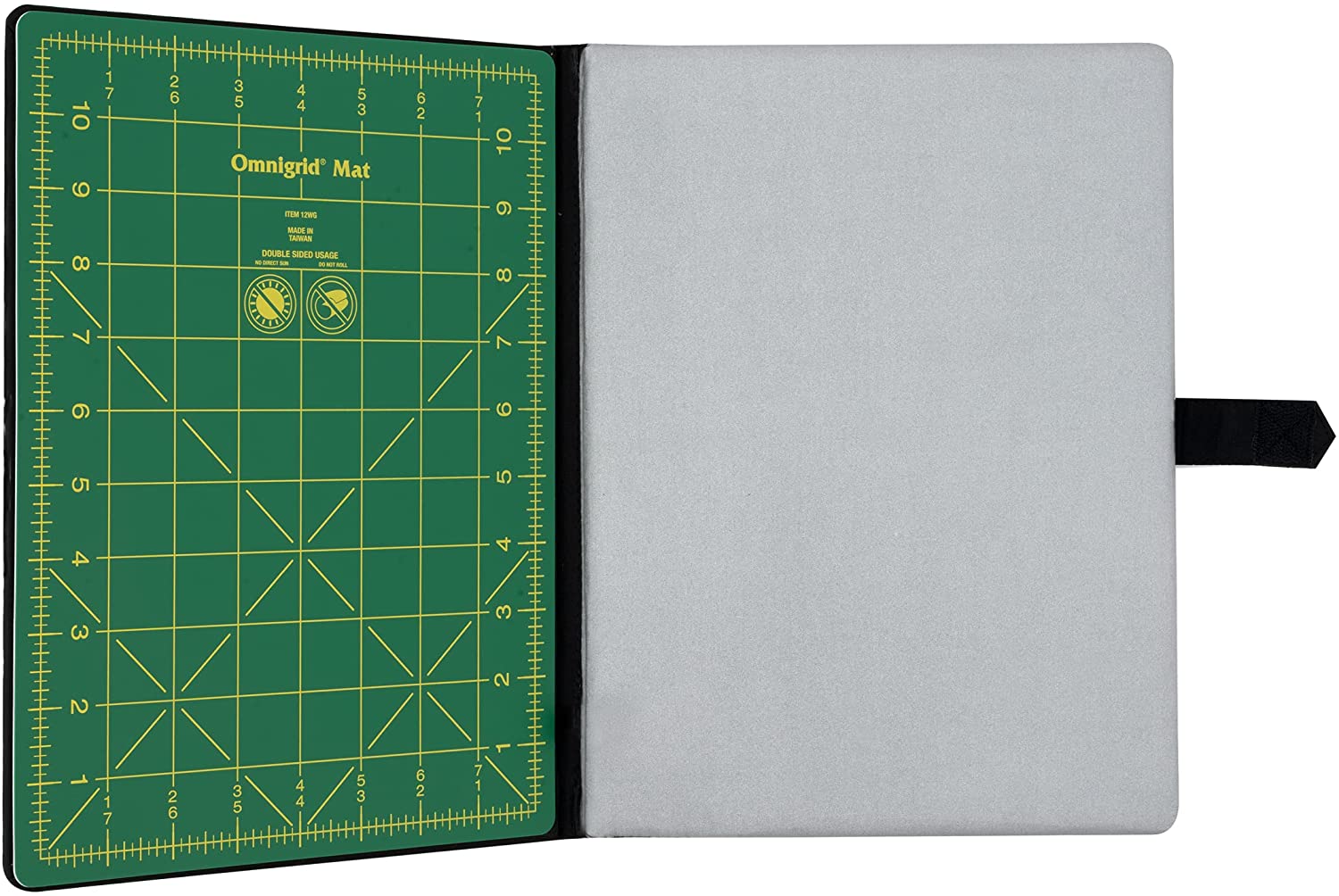 The Omnigrid Gear tote size FoldAway is a portable pressing and cutting station for quilters and sewists. It features an 8" x 11" Omnigrid cutting mat and non-stick ironing surface. It is ideal for trimming and pressing foundation blocks, and for cutting around templates.