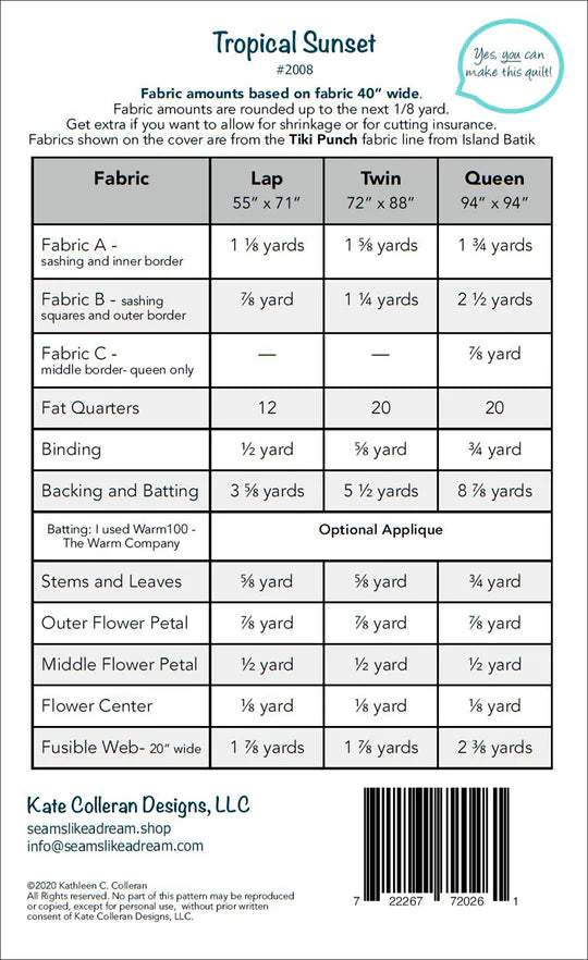 Cutting and piecing instructions for a quilt in 3 sizes: