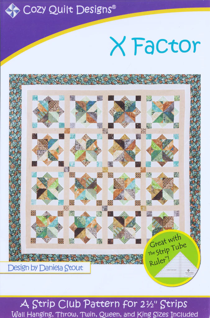 See how any strip bundle can be turned into a quilt of beauty. Contemporary but traditional, X Factor brings out the best of any strip set. The fun blocks are totally today’s look, and the sashing and cornerstone give it the time-honored style of an old-world quilt. This one is great with The Strip Tube Ruler